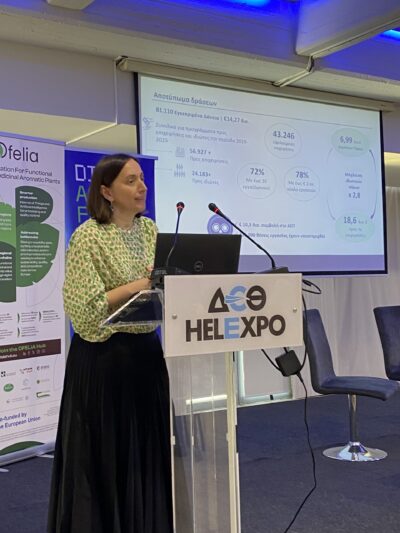 Ο Ιωάννης Αμαραντίδης, Project Manager των έργων Ofelia και DigiAgriFood, παρουσίασε το έργο OFELIA, το οποίο επικεντρώνεται στα λειτουργικά τρόφιμα και τα αρωματικά και θεραπευτικά φυτά. Τόνισε πως ο στόχος του έργου είναι η ενίσχυση της καινοτομίας και του ψηφιακού μετασχηματισμού σε όλη την αλυσίδα αξίας, από την παραγωγή έως τη διάθεση των προϊόντων, μέσω διαπεριφερειακής συνεργασίας και σύγχρονων τεχνολογιών.