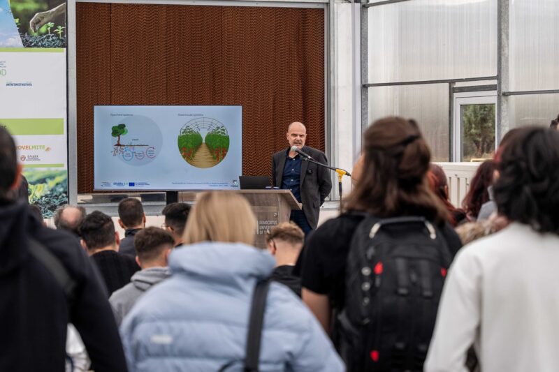 Η εκδήλωση έκλεισε με επίσκεψη στις εγκαταστάσεις του νέου “έξυπνου” θερμοκηπίου του Ινστιτούτου Αγροοικολογίας και Ψηφιακής Γεωργίας (ΠΑΚΕΚ-ΔΠΘ), όπου παρουσιάστηκε ο σύγχρονος εξοπλισμός που αποκτήθηκε μέσω του έργου «Πανεπιστήμια Αριστείας». Ερευνητικές ομάδες του Ινστιτούτου παρουσίασαν καινοτόμες ψηφιακές εφαρμογές για τη διαχείριση της φυτικής παραγωγής, ενώ ακολούθησε διάλογος με το κοινό σε θέματα που αφορούσαν τον ψηφιακό μετασχηματισμό και την πράσινη μετάβαση στη γεωργία, με έμφαση σε παραμέτρους που σχετίζονται με το κόστος παραγωγής, την προσαρμογή στην κλιματική αλλαγή, την προστασία του περιβάλλοντος και την υγεία των καταναλωτών.