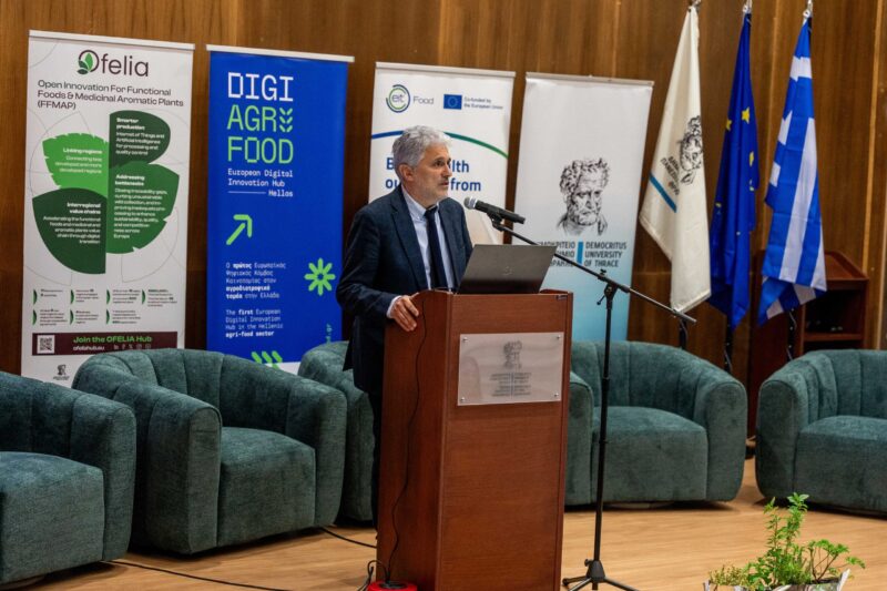 Με επιτυχία πραγματοποιήθηκε η ημερίδα «Αγροδιατροφή και Ψηφιακή Καινοτομία: το ΔΠΘ ως καταλύτης ανάπτυξης», την Παρασκευή 7 Νοεμβρίου 2025, στο Αμφιθέατρο του Τμήματος Πολιτικών Μηχανικών στην Πανεπιστημιούπολη Κιμμερίων της Ξάνθης. Η εκδήλωση συνδιοργανώθηκε από εμβληματικές δράσεις και ερευνητικές πρωτοβουλίες του Δημοκρίτειου Πανεπιστημίου Θράκης στον τομέα της Αγροδιατροφής: τον Πρώτο Ευρωπαϊκό Κόμβο Ψηφιακής Καινοτομίας, DigiAgriFood, το EIT Food Hub Greece, καθώς και τα ευρωπαϊκά έργα DIGI-Rangeland και OFELIA.
