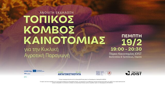 Το Πανεπιστήμιο Θεσσαλίας, ως εταίρος του πρώτου Ευρωπαϊκού Κόμβου Ψηφιακής Καινοτομίας στον τομέα της Αγροδιατροφής στην Ελλάδα, #DigiAgriFood, και το JOIST Πάρκο Καινοτομίας, συντονιστής εταίρος στην Ελλάδα του έργου Biofarms, συνδιοργανώνουν την ανοιχτή εκδήλωση με τίτλο: «Τοπικός Κόμβος Καινοτομίας για την Κυκλική Αγροτική Παραγωγή». Η εκδήλωση θα πραγματοποιηθεί την Πέμπτη 19 Φεβρουαρίου 2026, ώρες 19:00–20:30, […]